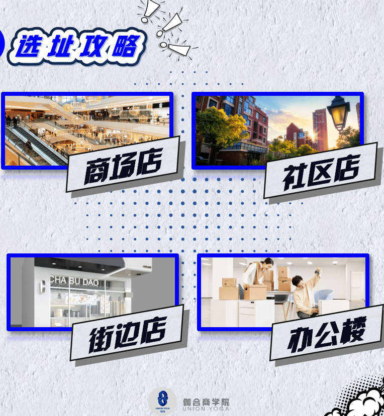 选址有商场,社区,街边,办公楼四大选择。
