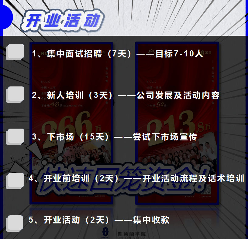 在签约完店铺合同之后就应该开始着手准备了,假设装修30天,这期间你会馆的招聘、培训、收集客户资源,谈单卖卡技能培训,人员培养就开始同步进行了!时间就是金钱啊,宝贝们!从装修进场那天开始,你的剩余资金就进入倒计时了!